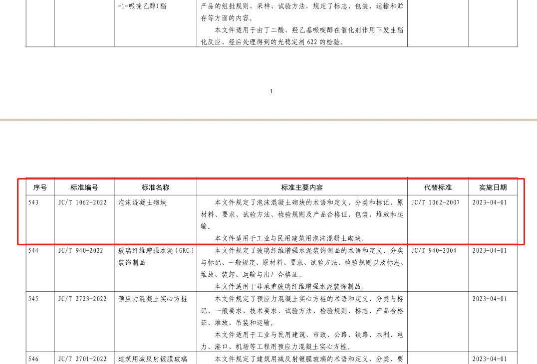 近日,從(cong)中華人民共(gong)和國工業和(hé)信息化部網(wǎng)站第2022 年第 23 号(hao)公告了解到(dao),工業和信息(xī)化部批準建(jian)材行業 111 項的(de)通知,行業标(biāo)準修改單及(ji)行業标準樣(yang)品自發布之(zhī)日起實施。其(qi)中包括批準(zhǔn)了《JC/T 1062-2022 泡沫混凝(ning)土砌塊》代替(ti)原有的《JC/T 1062-2007泡沫(mo)混凝土砌🚶塊(kuài)》行業标準的(de)決定,該建材(cái)行業标準(含(hán)外文版)由中(zhong)國建材工業(yè)出版社出版(ban),該行業标準(zhǔn)将于2025年11月30日(rì)實施。